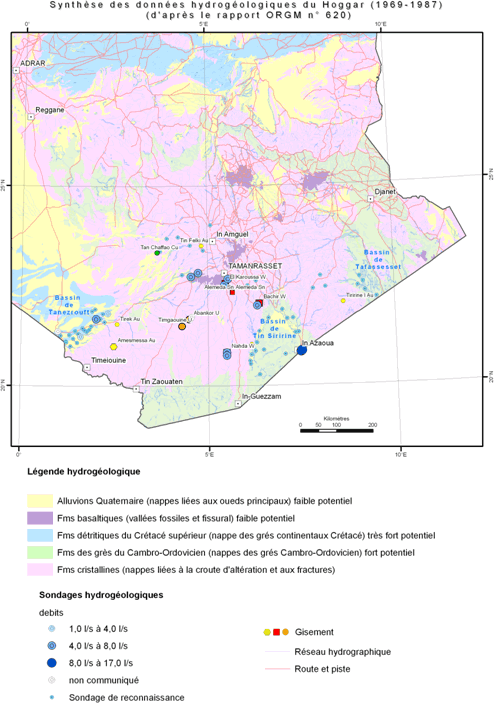 • aquiferous of the sandstones of Cambro-Ordovicien, of the basins of Chock-Seririne (borders Southern of Hoggar) and of Tafassasset (SE of Hoggar borders): the exploitable reserves are significant (great side extension but power of the variable sandstone);